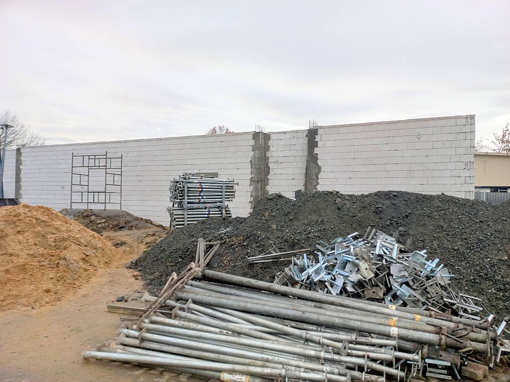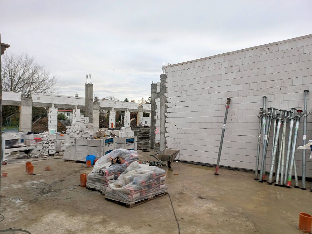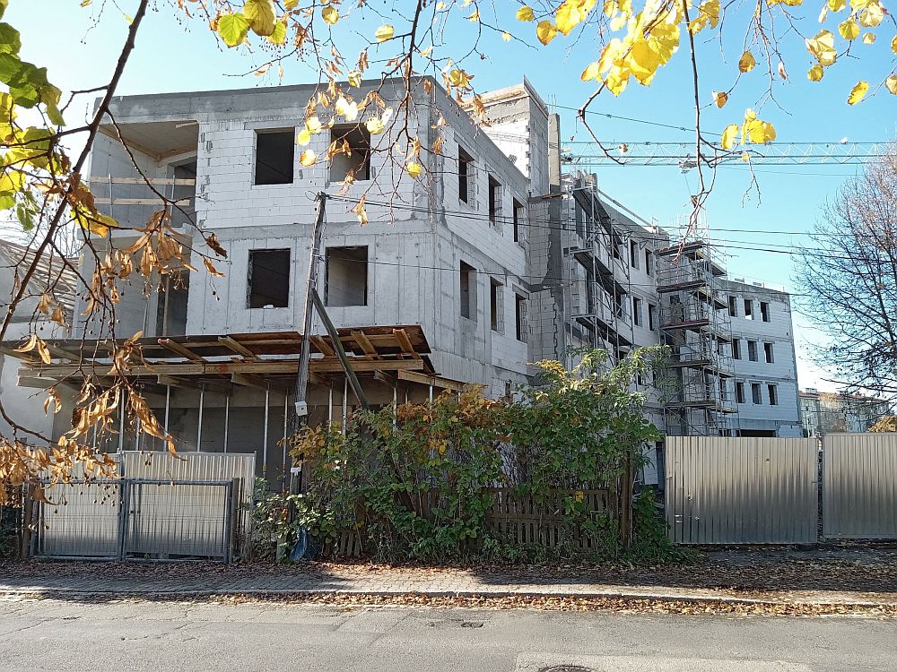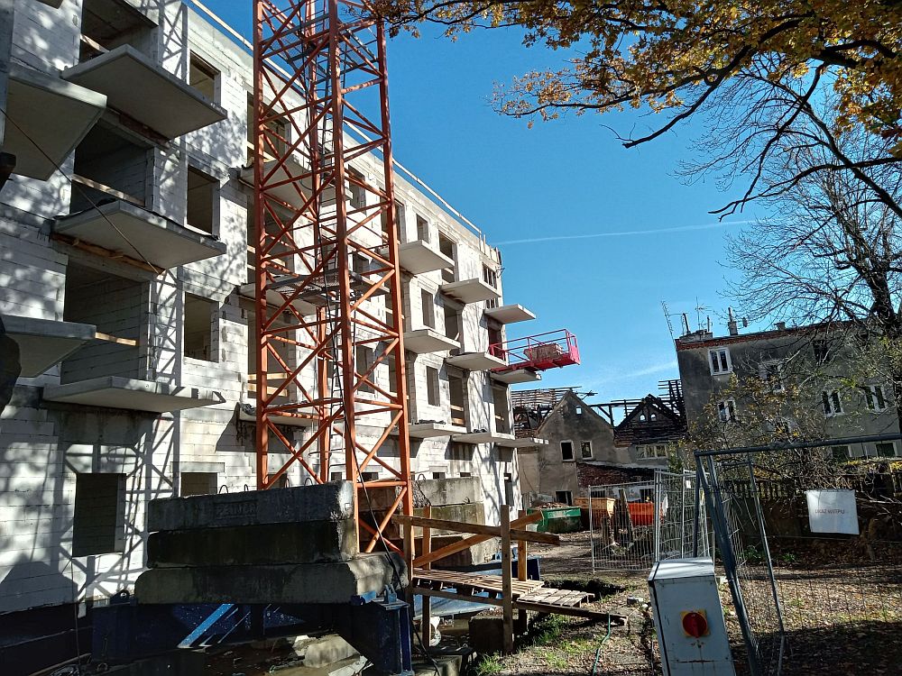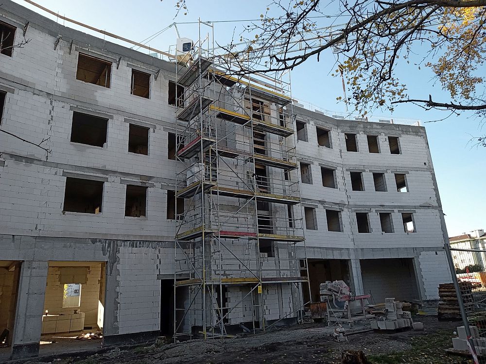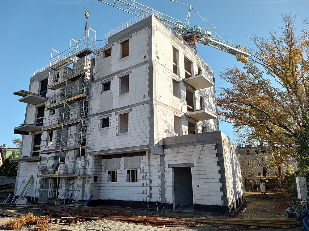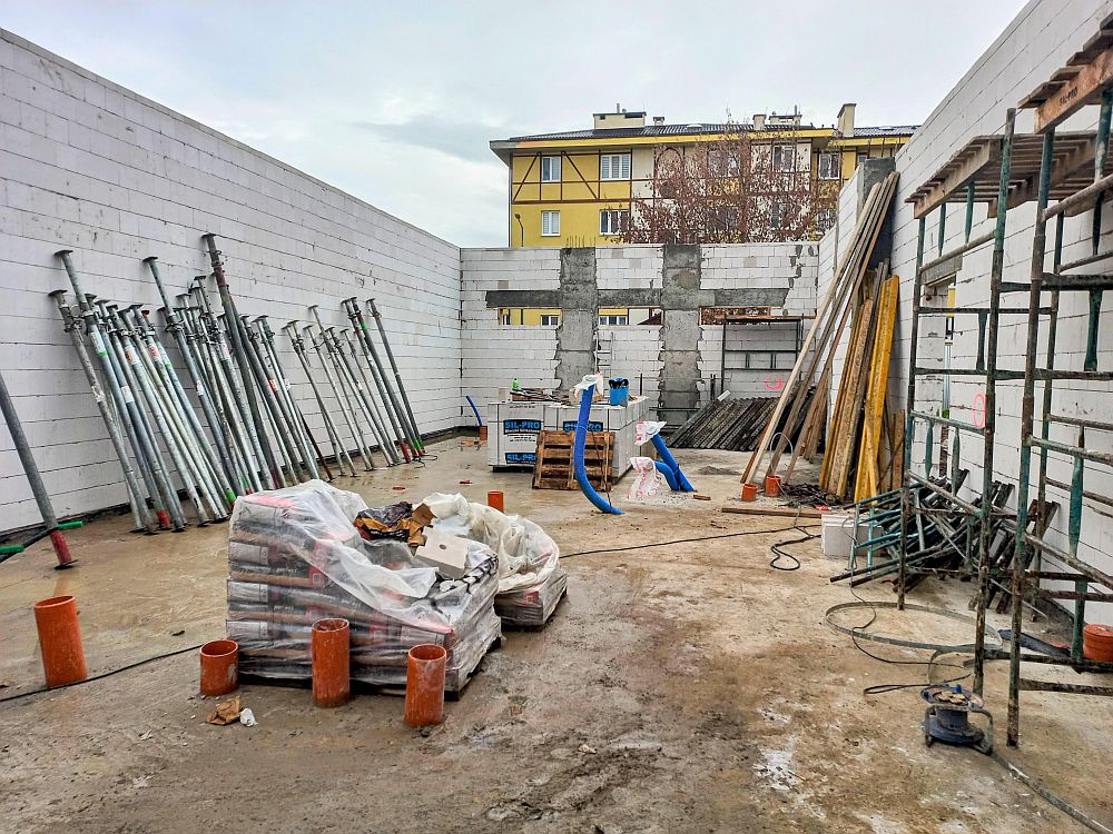 Powstały już fundamenty, ściany nośne wszystkich kondygnacji, a także stropy oraz stropodach. Aktualnie trwają prace nad murowaniem ścian działowych na trzech pierwszych kondygnacjach nowego budynku (26 mieszkań). Trwa również przebudowa istniejącego budynku, zlokalizowanego na terenie inwestycji (4 mieszkania). Prowadzimy prace rozbiórkowe elementów przebudowywanych wewnątrz budynku oraz dachu wraz z konstrukcją. W najbliższym czasie przed nami pokrycia dachu płaskiego, montaż stolarki okiennej, montaż instalacji sanitarnych i elektrycznych.