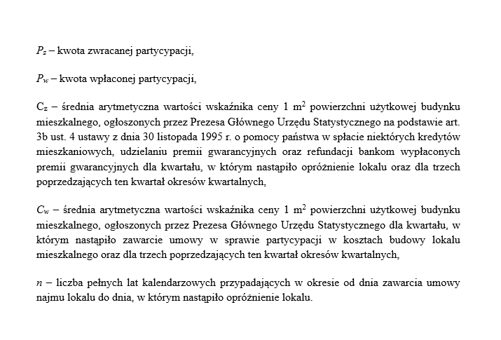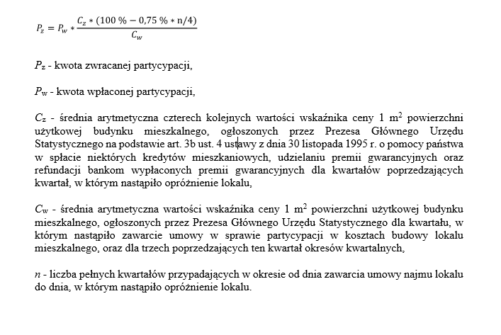 To, jak partycypacja pracuje dla swojego właściciela, wynika wprost z przepisów ustawy o społecznych formach rozwoju mieszkalnictwa. Dla umów zawartych do dnia 24 października 2015 r., kwota zwracanej partycypacji odpowiada kwocie stanowiącej odsetek aktualnej wartości odtworzeniowej lokalu równy udziałowi wniesionej przez najemcę kwoty partycypacji w kosztach budowy lokalu.