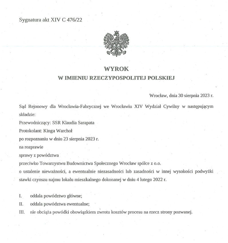 Poniżej prezentujemy zanonimizowaną treść jednego z wyroków Sądu Rejonowego dla Wrocławia - Fabrycznej, XIV Wydziału Cywilnego, w sprawie zmiany stawek czynszu w TBS Wrocław w 2022 r. Pełna treść wyświetli się po kliknięciu w obrazek.